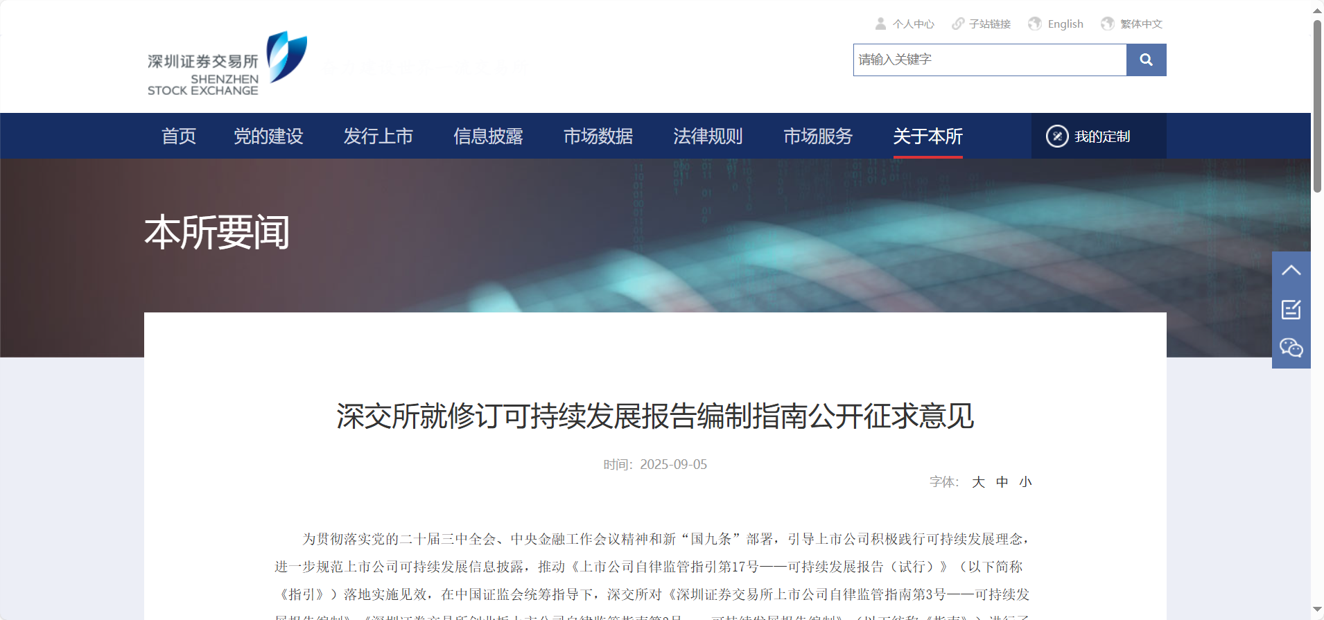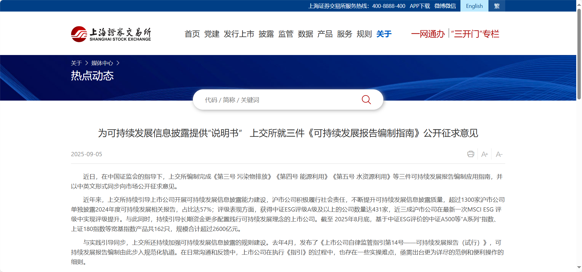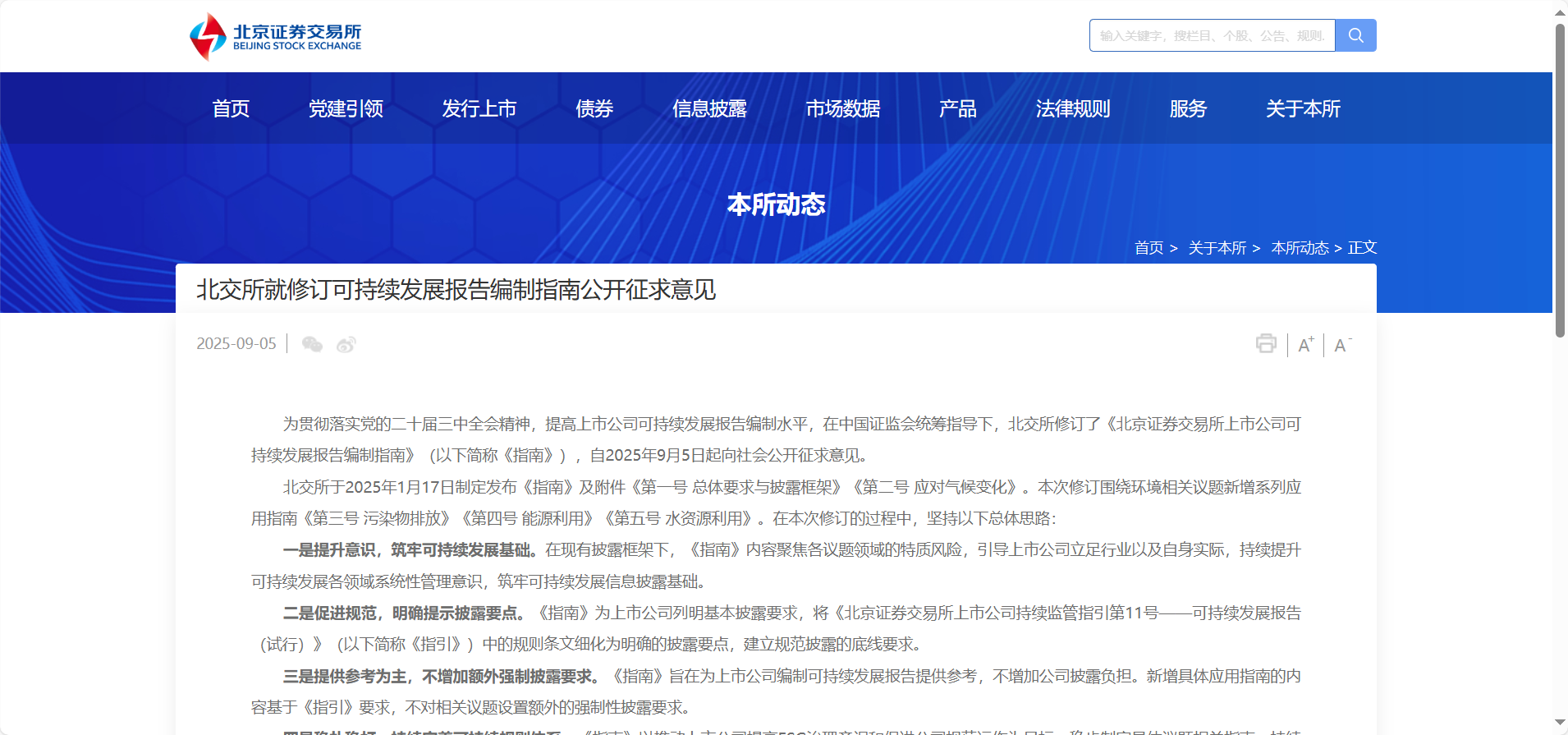 9月5日,在中国证监会统筹指导下,沪深北交易所就修订可持续发展报告编制指南公开征求意见,反馈截止日为9月19日。本次修订将新增《第三号 污染物排放》《第四号 能源利用》《第五号 水资源利用》三项应用指南。