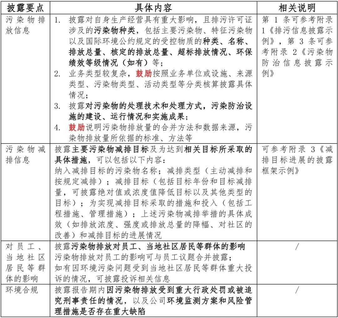 披露要点包括污染物排放信息、污染物减排信息、对员工、当地社区居民等群体的影响、环境合规信息。