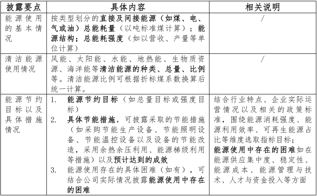 披露要点包括能源使用的基本情况、清洁能源使用情况、能源节约目标以及具体措施情况。