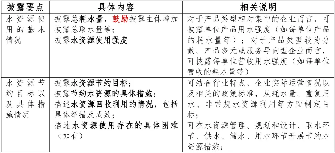 披露要点包括水资源使用的基本情况、水资源节约目标以及具体措施情况。